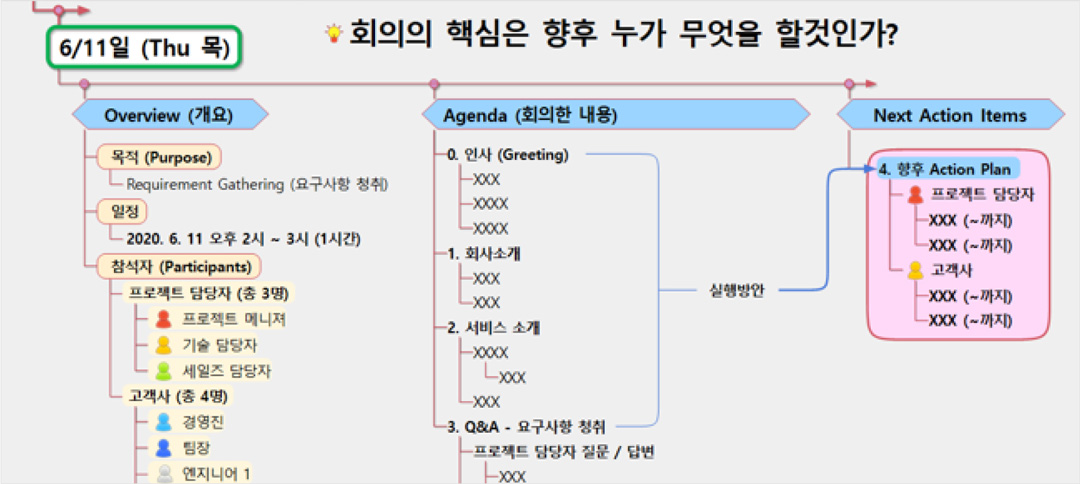 - 작성방법: 자료관리 (하이퍼링크/첨부), 일정관리, 개체삽입, 관계 연결선/묶기